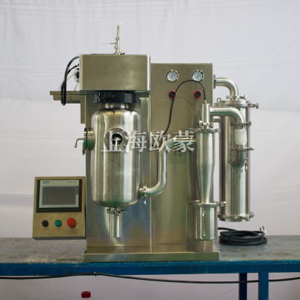 經(jīng)過前道工序處理后的料液利用蠕動泵送至干燥室上方的霧化器,將料液均勻地霧化為極微米霧滴群,進入干燥室內,氣體進入加熱系統(tǒng),被加熱至工藝所需的溫度,經(jīng)熱風管道均勻進入干燥室,與霧滴群接觸后高溫固化,熱解成產(chǎn)品,干燥后的成品隨同尾氣經(jīng)出風管送至旋風分離器進行氣固分離 ,成品回收,飽和尾氣經(jīng)過除塵器濾芯過濾后進入OM-YJ-500型氮氣循環(huán)有機溶劑回收裝置的冷凝器進行溶劑回收,經(jīng)過冷凝后的氮氣再次進入加熱器循環(huán)使用。